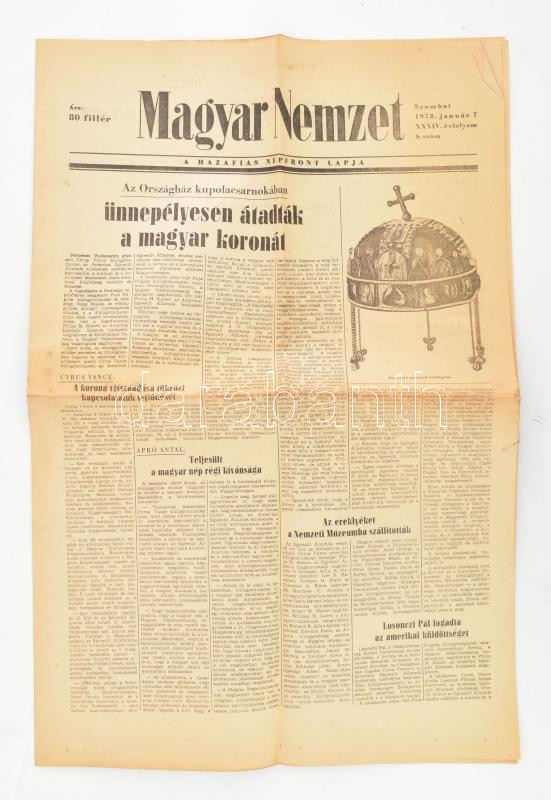 1978 Magyar Nemzet, a Hazafias Népfront lapja XXXIV. évf. 6. sz., 1978... https://www.darabanth.com/en/457-Online-auction/457.0/Art-and-other-collectibles/Printed-Materials~2000363/1978-Magyar-Nemzet-a-Hazafias-Nepfront-lapja-XXXIV-evf-6-sz-1978-jan-7-a-cimlapon-Az-~II3056901