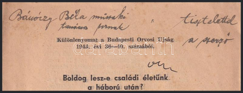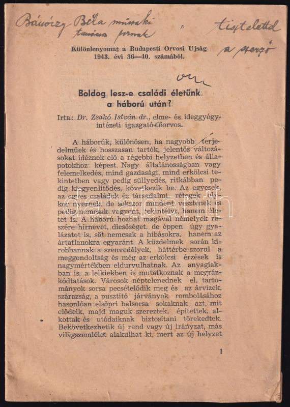 Dr, Zsák István: Boldog lesz e családi életünk a háború után. DEDIKÁLT különlenyomat 18 p