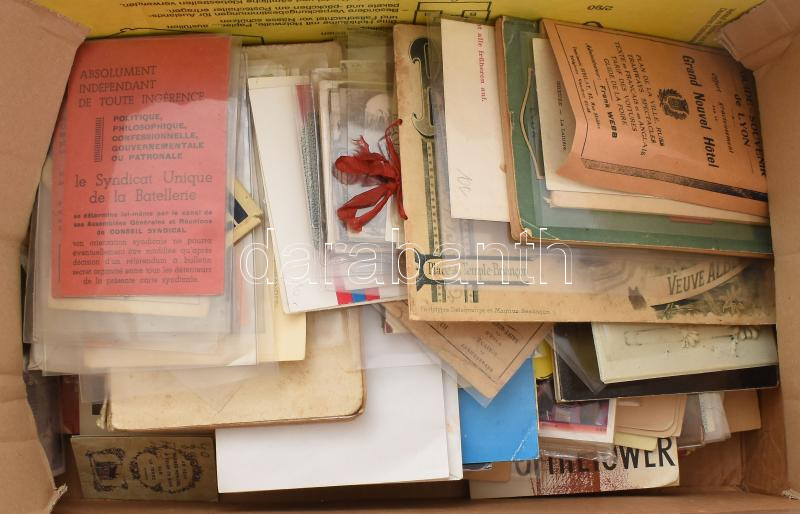 Nagy doboznyi vegyes papírrégiség tétel, benne fotókkal, nyomtatványok...
