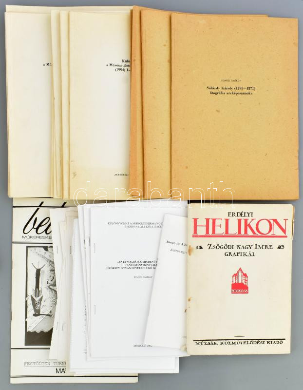 Vegyes művészettörténeti-történelmi nyomtatvány tétel, össz. kb. 49 db, többségében Sümegi György művei: Erdélyi Helikon. Zsögödi Nagy Imre grafikái. Szerk.: Dr. Gróh Gáspár. Bp., 1992, Múzsák Közművelődési Kiadó. Kiadói papírkötés. foltos. + Sümegi György: A Duna-Tisza köze rajzi topográfiájából. Bodor Miklós képei. Kiskunhalas, 2004, Thorma János Múzeum. Halasi Múzeum 2.-ből kiemelve. 2 p. Tűzve. (7 példány) + Sümegi György: Fotók a Történeti Levéltárban. Trezor 3. Az átmenet évkönyve, 2003-ból kiemelve. 10 p.+10t, 1956-al kapcsolatos képek. (10 példány) + Az etnográfus mindenütt talál tanulmányozni valót." (Györffy György levelei Lükő Gábornak, 1931-33.). Miskolc, 2002, Hermann Ottó Múzeum évkönyve. 379-387 p. Kiadói papírkötés (3 példány) + Sümegi György: Inconnu: A harcoló város/The Fighting City, 1986. Kísérlet egy elmaradt kiállítás rekonstrukciójára. Bp., 2010., L'Harmattan. Fekete-fehér fotókkal illusztrált. Különlenyomat. Kiadói papírkötés. + Sümegi György: Szilárdy Károly (1795-1871) litográfiai arcképcsarnoka. (1983, Művészettörténeti Értesítő), 6 példány; Sümegi György: Fehéren feketén. (Korporációs és grafikai vázlat.) (2000, Maradandóság és változás - Művészettörténeti Konferencia.), 4 példány + Göböl Gáspár (1745-1818), a művészetpártoló (1994, Művészettörténeti Értesítő), 29 példány