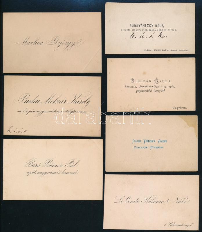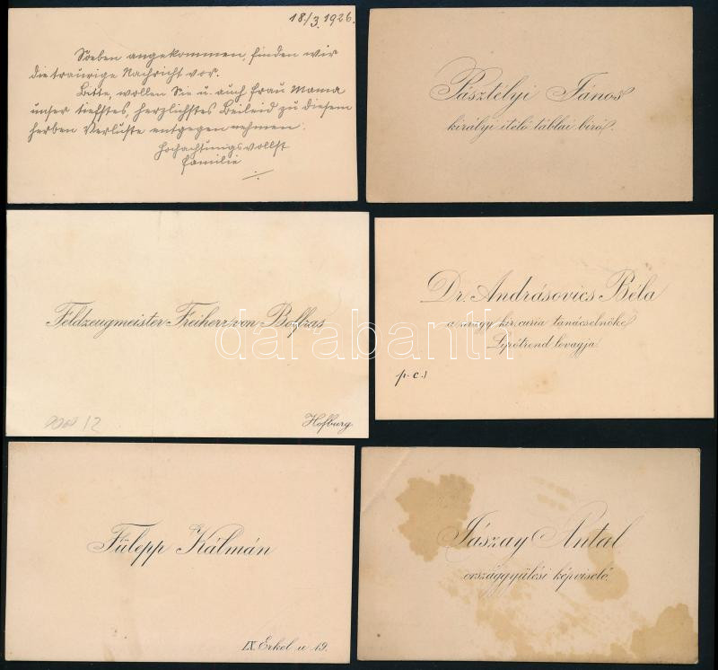 cca 1880-1926 Vegyes, izgalmas névjegykártya gyűjtemény, közte több híres személy, össz. 12 db, közte 3 db autográf sorokkal: Fülepp Kálmán (1851-1919), Budapest főpolgármestere (1906-1912), hátoldalán autográf részvétnyilvánító sorai; gróf Nákó Kálmán (1822-1902) politikus, császári és királyi kamarás; báró Bémer Pál; apát, nagyváradi kanonok; báró Vécsey József (1829-1902) országgyűlési képviselő, zabolchi (szabolcsi) főispán; báró Arthur Heinrich Bolfras Freiherr von Ahnenburg (1838-1922) osztrák-magyar vezérezredes, korábban I. Ferenc József főhadsegédje, hátoldalán autográf német ny. soraival 1908-ból; Rudolf Jüttner osztrák festő, hátoldalán autográf német ny. soraival 1926-ból, stb.