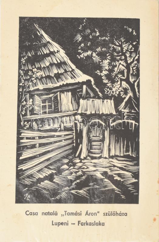 cca 1940 Tamási Áron szülőháza Farkaslakán (Erdély), fametszet, 17×11,...