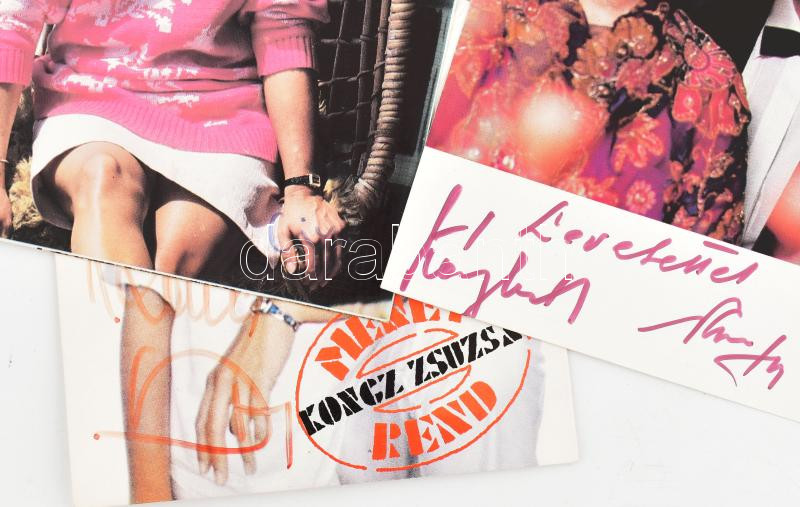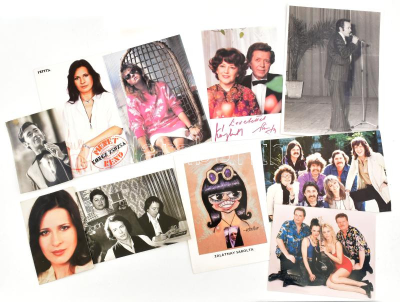 Description: cca 1970-2000 Magyar zenei előadókat ábrázoló fotók, nyomatok, össz. 10 db, közte 3 db DEDIKÁLT/aláírt: Koncz Zsuzsa, Zalatnay Sarolta, Záray Márta - Vámosi János. Vegyes méretben.