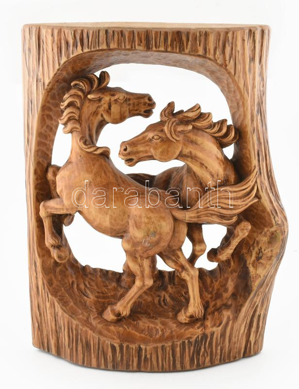 Ismeretlen szobrász: Lovak falikép. Faragott fa, jelzés nélkül, a fa természetes repedését leszámítva hibátlan, akasztható, 41x28 cm