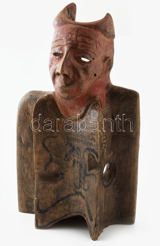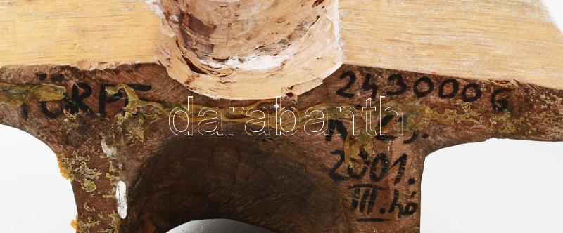 Katona Zsuzsa (1951-): Törpe. 2001, faragott fa. Jelzett, m: 36 cm /// Munkácsy-díjas szobrászművész. Fából vagy kőből faragott, ritkábban mintázott, bronzból öntött, általában homloknézetre komponált, idolszerű, időtlenséget sugárzó figurákat alkot, amelyeknek teste sokszor üreges, kéregszerű. Szobrainak felületén kozmikus utalásokat hordozó ráfestések, karcolások jelennek meg."