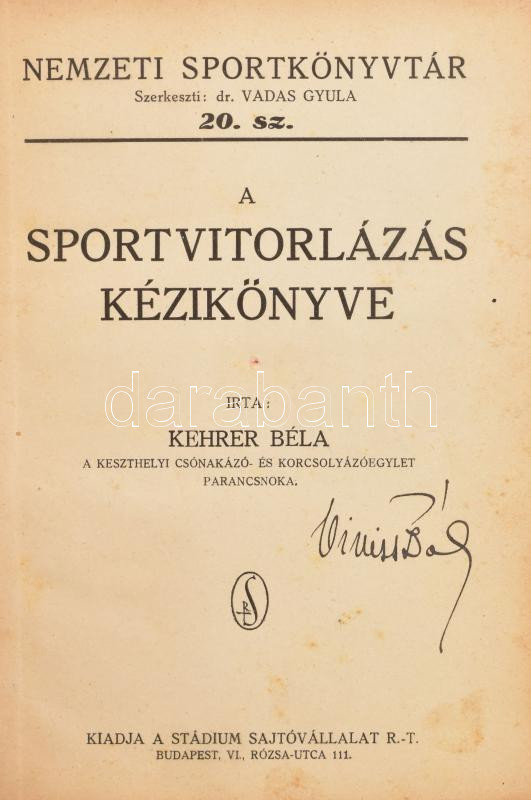 Kehrer Béla: A sportvitorlázás kézikönyve. Nemzeti Sportkönyvtár 20. sz. Bp.,[1926],Stádium, 102+1+8 (kézzel írt jegyzetek) p. Fekete-fehér illusztrációkkal. Átkötött egészvászon-kötés, foltos borítóval, kissé foltos lapokkal, névbejegyzéssel, ceruzás aláhúzásokkal. Keszthelyi Csónakázó- és Korcsolyázóegylet kiadványa. Az egylet nevet váltott, 1930. jún. 3-tól Keszthelyi Yacht Club lett.