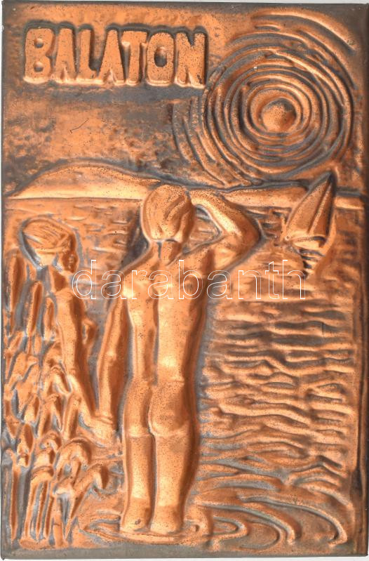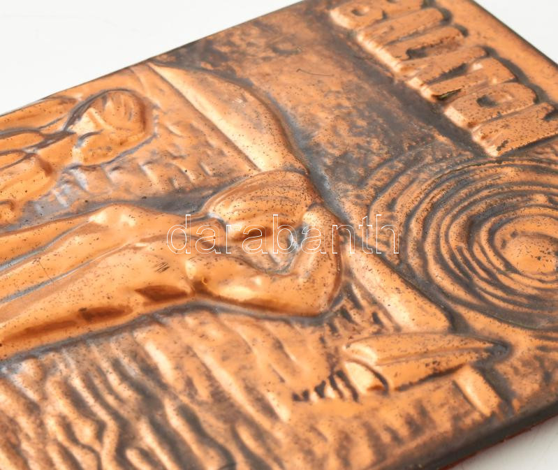 Retró, Balaton témájú, réz, aktot ábrázoló fali kép, 21×13,5 cm