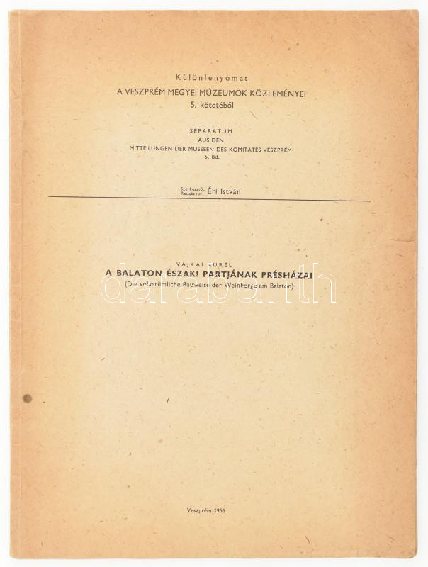Vajkai Aurél: A Balaton északi partjának présházai. Különlenyomat a Veszprém Megyei Múzeumok Közleményei 5. kötetébÅ‘l. Veszprém, 1966, (Franklin-ny.), 181-246 p. + 1 (kihajtható térkép) t. Fekete-fehér képekkel illusztrálva. Kiadói papÃrkötés, kissé sérült, a könyvtesttÅ‘l elvált borÃtóval, ajándékozási bejegyzéssel.