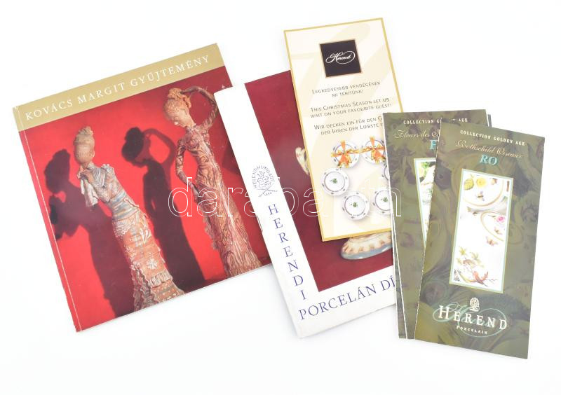 2 db katalógus: Kovács Margit gyűjtemény. A kiállítást rendezte, a katalógust összeáll.: Petényi Katalin. Szentendre, 1978, Pest Megyei Múzeumok Igazgatósága. Fekete-fehér fotókkal illusztrált. Kiadói papírkötés. + Molnár László: Herendi porcelán díszmű. Kecskemét, 1967, Bács-Kiskun megyei Nyomda, 42 p. Kiadói tűzött papírkötés. + 6 db Herendi porcelán prospektus (Rotschild, Viktória, Indiai kosár, stb. minták)