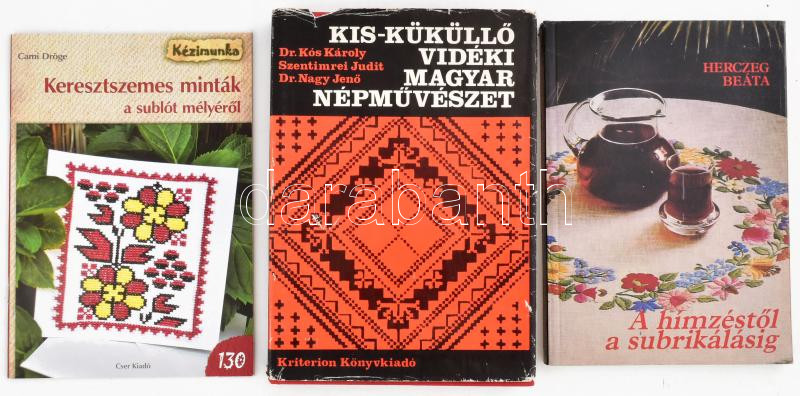 3 db népművészet és kézimunka témájú könyv: Kós Károly - Szentimrei Judit - Nagy Jenő: Kis-Küküllő vidéki magyar népművészet. Bukarest, 1978, Kriterion. Fekete-fehér képekkel illusztrálva. Kiadói egészvászon-kötés, kissé sérült kiadói papír védőborítóban. + Herczeg Beáta: A hímzéstől a subrikálásig. Kézimunkakönyv kezdőknek és haladóknak. Bp., 1988, szerzői kiadás. Kiadói papírkötés. + Cami Dröge: Keresztszemes minták a sublót mélyéről. Bp., 2018, CSER Kiadó. Kiadói tűzött papírkötés.