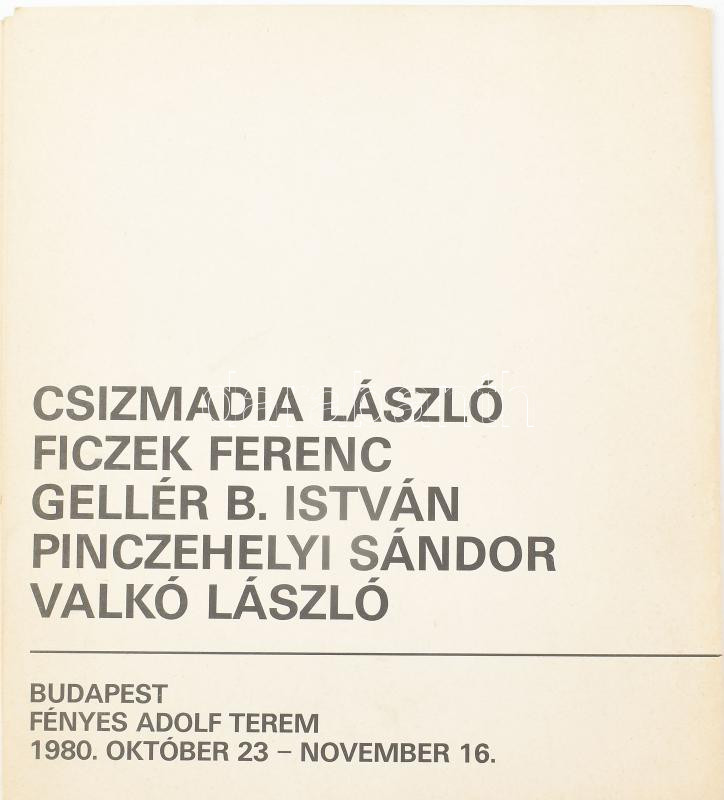 Description: Csizmadia László, Ficzek Ferenc, Gellér B. István, Pinczehelyi Sándor, Valkó László. Budapest, Fényes Adolf Terem, 1980. A művészek 1-1 munkájával illusztrált, kihajtható katalógus-prospektus.