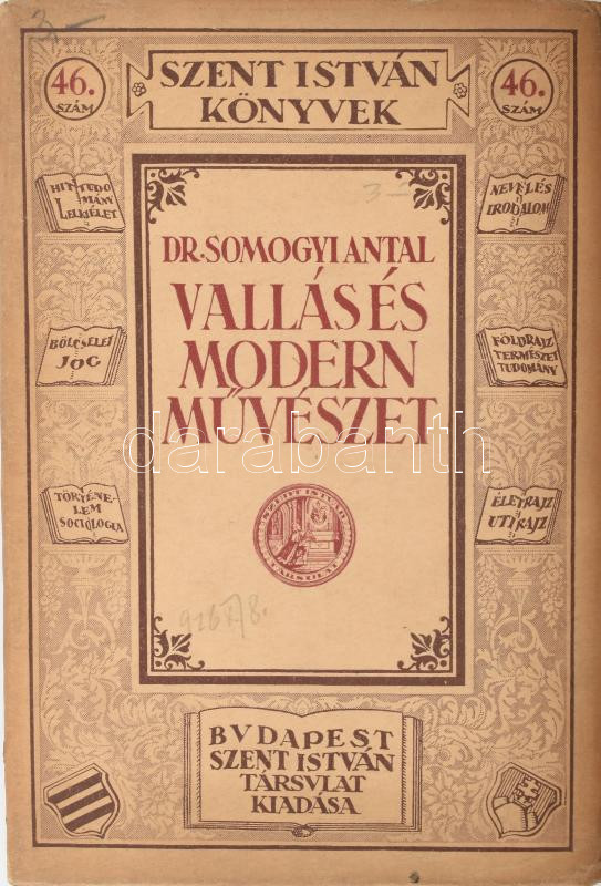 Dr. Somogyi Antal: Vallás és modern művészet. Szent István Könyvek 46.... https://www.darabanth.com/en/457-Online-auction/457.0/Books/Books-Architecture-Art~2000364/Dr-Somogyi-Antal-Vallas-es-modern-muveszet-Szent-Istvan-Konyvek-46-sz-Bp-1927-Szent-Is~II3053692
