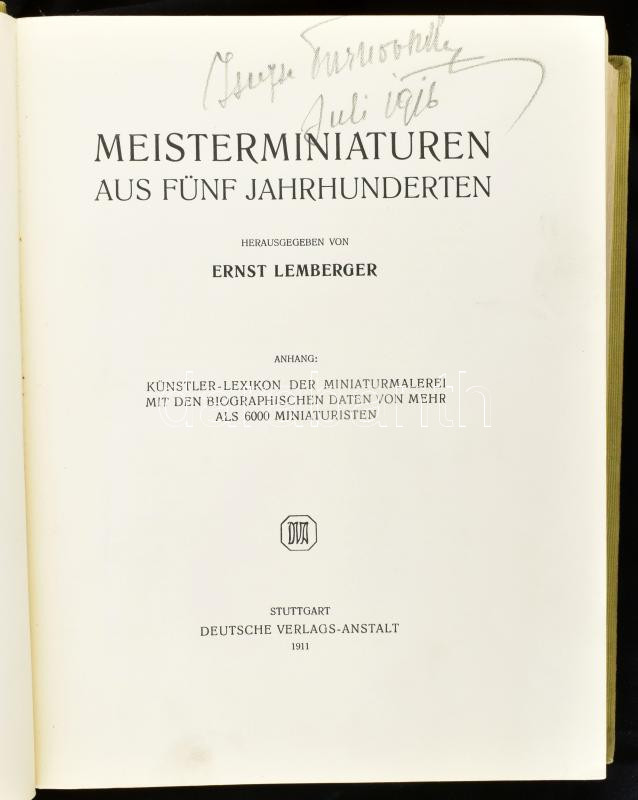 Ernst Lemberger: Meisterminiaturen aus fünf jahrhunderten. Stuttgart, 1911, Deutsche Verlags-Anstalt, 36 p. + 75 t (színes miniaturákat ábrázoló táblák).+111 p. Kiadói aranyozott egészvászon kötés kissé foltos. Több mint 6000 miniaturista adataival. Német nyelven. / Cloth-binding, in german language, it illustrated with 75 pictures. The cover is little bit spotty.