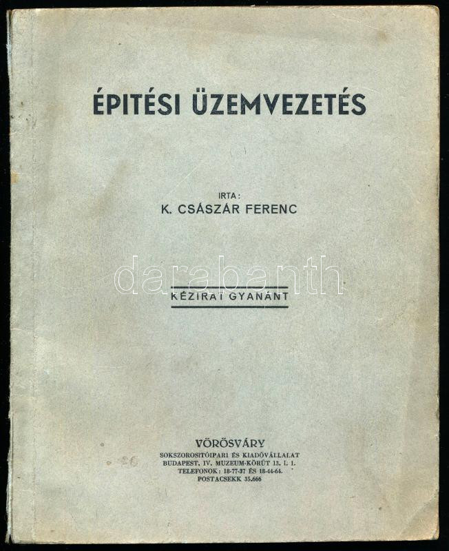 https://www.darabanth.com/en/457-Online-auction/457.0/Books/Books-Architecture-Art~2000364/K-Csaszar-Ferenc-Epitesi-uzemvezetes-Bp-en-Vorosvary-2plus84-p-Kiadoi-papirkotes~II2957964