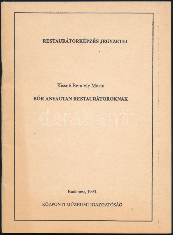 Kissné Bendefy Márta: Bőr anyagtan restaurátoroknak. Restaurátorképzés jegyzetei. Bp., 1990, Központi Múzeumi Igazgatóság, 41+(1) p. Fekete-fehér illusztrációkkal. Kiadói tűzött papírkötés. Megjelent 500 példányban.