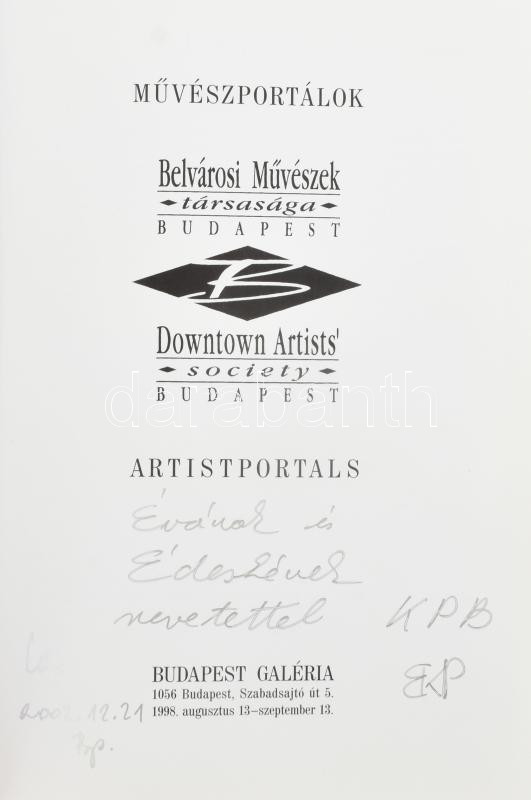 Kovács Péter Balázs (szerk.): Művészportálok. Budapest Galéria 1998 aug. 13 - szept. 13. A szerkesztő, Kovács Péter Balázs (1955-) által Haraszty István "Édeskének" (1934-2022), Kossuth-díjas szobrász, festőművésznek és feleségének DEDIKÁLT! Bp.,1998, Belvárosi Művészek Társasága. Magyar és angol nyelven. Fekete-fehér és színes képekkel, többek közt El Kazovszkij, Keserü Ilona, Pauer Gyula portréinak és műveinek reprodukcióival gazdagon illusztrált, terjedelmes katalógus. Kiadói kartonált papírkötés, jó állapotban.