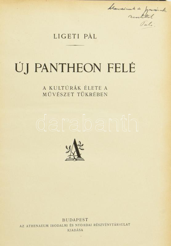 Ligeti Pál: Új Pantheon felé. A kultúrák élete a művészet tükrében. A ... https://www.darabanth.com/en/457-Online-auction/457.0/Books/Books-Architecture-Art~2000364/Ligeti-Pal-Uj-Pantheon-fele-A-kulturak-elete-a-muveszet-tukreben-A-szerzo-Ligeti-Pal~II3035297