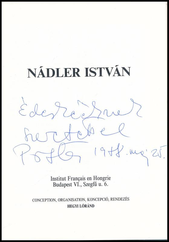 Nádler István. Kiállítási katalógus. Conception, organisation, koncepció, rendezés: Hegyi Lóránd. Hegyi Lóránd előszavával. A művész, Nádler István (1938-) Kossuth-díjas festőművész által Haraszty István "Édeskének" (1934-2022), Kossuth-díjas szobrász, festőművésznek DEDIKÁLT példány! Bp.,(1988),Institut Francais en Hongrie, 6 sztl. lev.+2 sztl. lev. Magyar és francia nyelven. A művész munkáinak reprodukcióival illusztrált. Kiadói papírkötés.