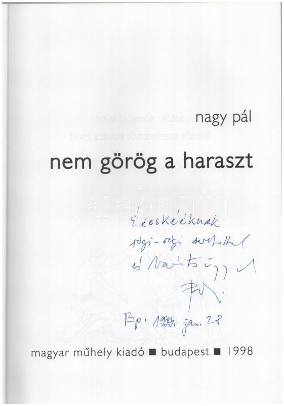 Nagy Pál: Nem görög a haraszt. A szerző, Nagy Pál (1934-) író, műfordító, tipográfus által Haraszty István "Édeske" (1934-2022), Kossuth-díjas szobrász, festőművész részére DEDIKÁLT példány. Somlósi Lajos fotóival. Bp., 1998, Magyar Műhely, 62 p. Kiadói papírkötés.