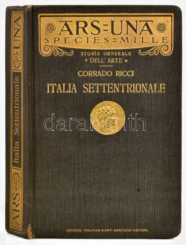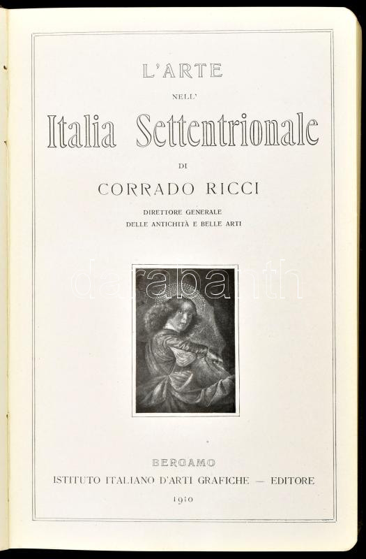 Description: Ricci, Corrado: L' arte nell' Italia Settentrionale. Bergamo, 1910, Istituto Italiano d'Arti Grafiche, X+442 p. Szövegközi és egészoldalas, fekete-fehér és színes képekkel gazdagon illusztrálva. Olasz nyelven. Kiadói aranyozott egészvászon-kötés, nagyrészt jó állapotban, a gerincen kis sérüléssel.