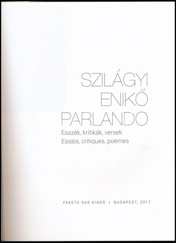 Szilágyi Enikő Parlando. Esszék, kritikák, versek. Essais, critiques, ... https://www.darabanth.com/en/457-Online-auction/457.0/Books/Books-Architecture-Art~2000364/Szilagyi-Eniko-Parlando-Esszek-kritikak-versek-Essais-critiques-poemes-Bp-2017-Fekete~II3037863