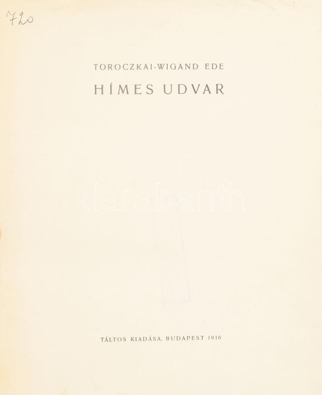 Description: Toroczkai Wigand Ede: Hímes udvar. Budapest, 1916, Táltos. Későbbi félvászon kötésben, intézményi bélyegzőkkel, volt könyvtári példány, néhány kevés lap kissé foltos.