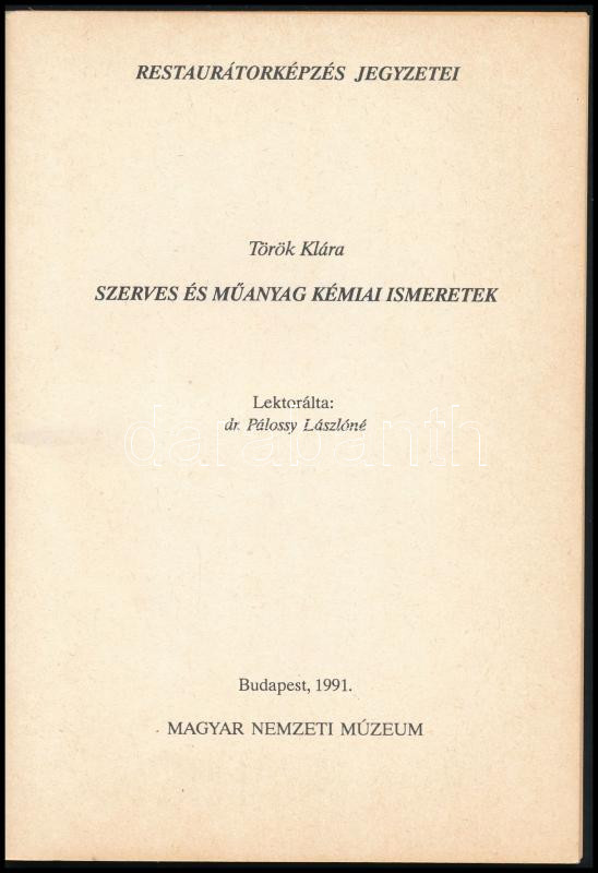Török Klára: Szerves és műanyag kémiai ismeretek. Restaurátorképzés jegyzetei. Bp., 1991, Magyar Nemzeti Múzeum, 66 p. Kiadói tűzött papírkötés.
