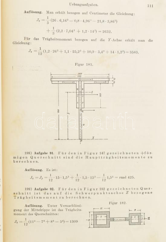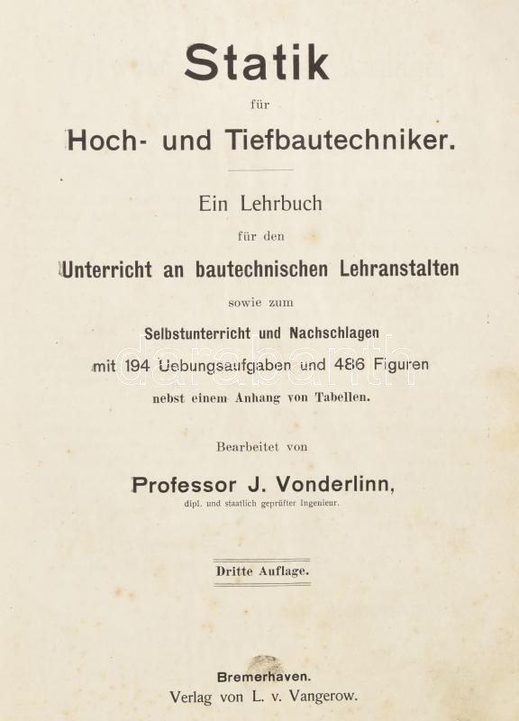 Vonderlinn, J.: Statik für Hoch- und Tiefbautechniker. Ein Lehrbuch für den Unterricht an bautechnischen Lehranstalten sowie zum Selbstunterricht und Nachschlagen mit 194 Uebungsaufgaben und 486 Figuren nebst einem Anhang von Tabellen. Bremerhaven, [1905], L. v. Vangerow, XI+(1)+377+(7) p. Német nyelven. Átkötött félvászon-kötésben, kissé viseltes, kopottas borítóval, helyenként kissé foltos.