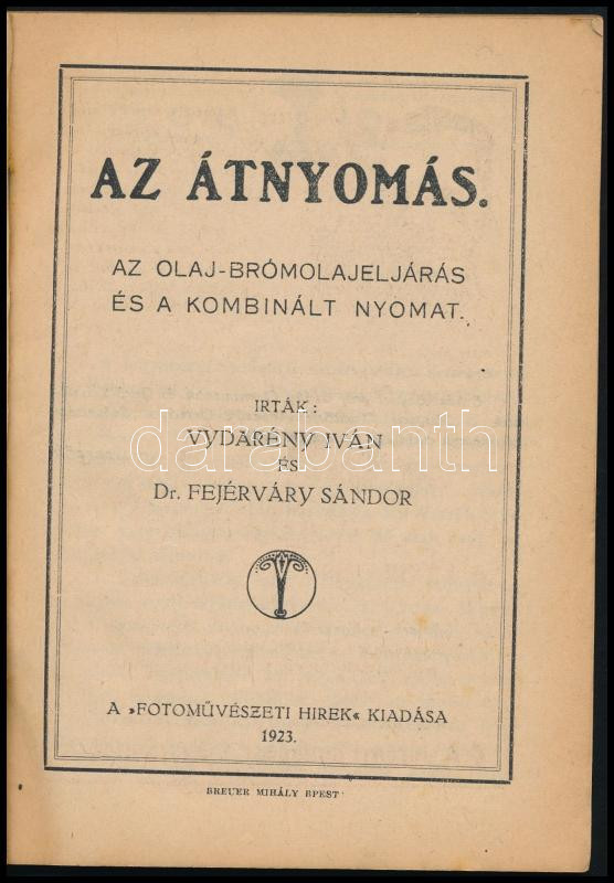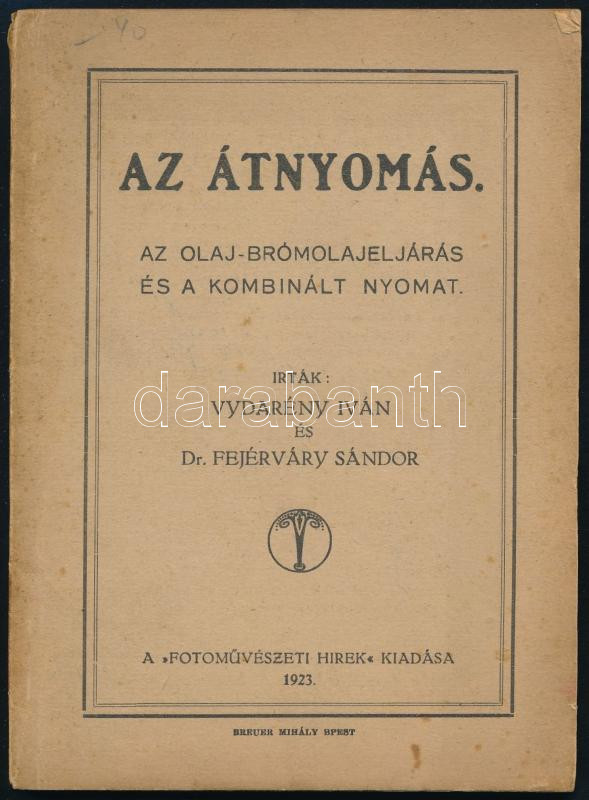 Vydarény Iván - Dr. Fejérváry Sándor: Az átnyomás. Az olaj-bromolajeljárás és kombinált nyomat. Bp., 1923, "Fotoművészeti HÃrek", (Breuer Mihály-ny.), 88+8 p. Kiadói papÃrkötés, kissé foltos lapszélekkel, a gerincen apró szakadással.