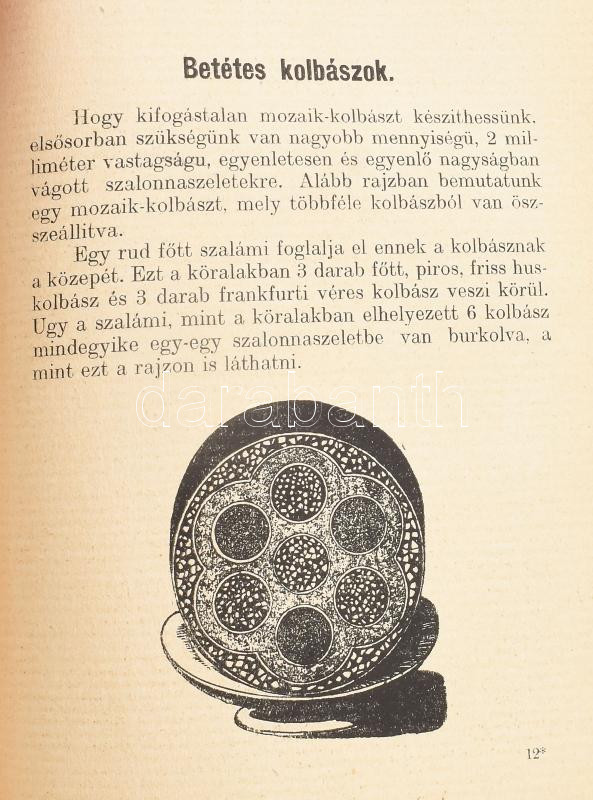 Bittner János: Finom hentesáruk könyve. Szerk.: - - hentesmester, a Budapesti Hentesipartestület és a Húsiparosok Országos Szövetségének elnöke. Bp., 1909., Mészárosok és Hentesek Lapja, (Budapesti Hirlap-ny), 216 p. Első kiadás! Szöveg közti rajzokkal illusztrált. Benne: Hus- és sonkapácolás. Szalámi. Vörös kolbászok. Nyersen ehető szárazkolbászok. Felvágottak. Májas fölvágottak. Véres hurkák. Disznósajtok. Főző- és sütnivaló huskolbászok. Szalonna. Zsirolvasztás. Különfélék. Saláták. Betétes kolbászok. Lóhentesáruk. Kóser hentesáruk. Hasznos tudnivalók. Korabeli reklámokkal. Korabeli aranyozott gerincű, díszes egészvászon-kötés, a borítón kis kopásnyomokkal, jó állapotban.