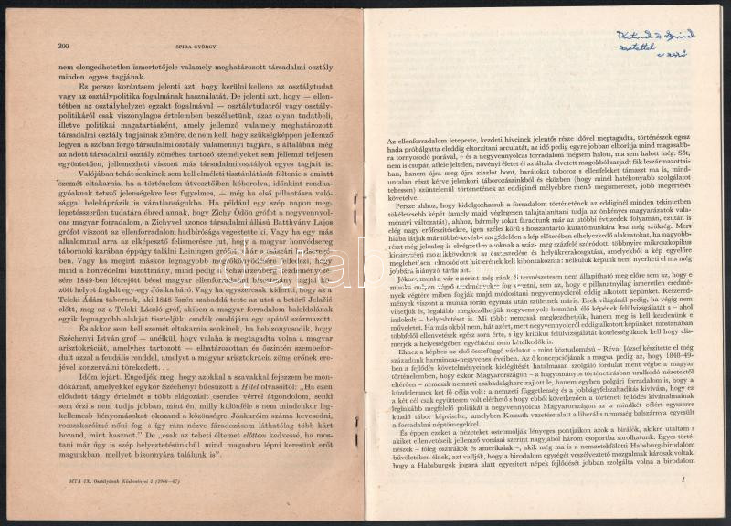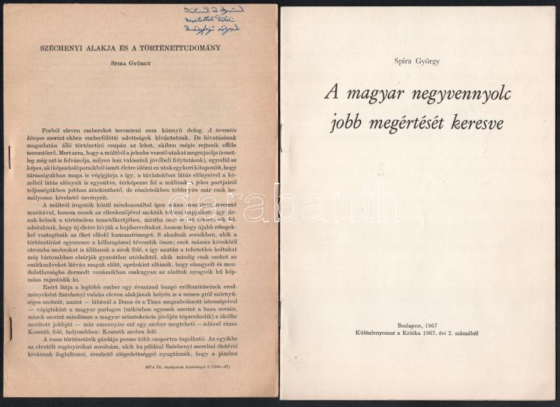2 db DEDIKÁLT Spira György különnyomat: A magyar negyvennyolc jobb megértését keresve. Különlenyomat a Kritika 1967. évi 2. számából. (Bp., 1967, Zrínyi-ny.), 13+(3) p. Kiadói tűzött papírkötés. + Széchenyi alakja és a történettudomány. In: MTA IX. Osztályának Közleményei 1. (1966-67). 193-200 p. Tűzött papírkötés. Mindkettő a szerző, Spira György (1925-2007) történész által DEDIKÁLT.