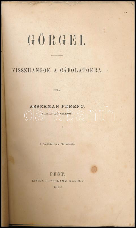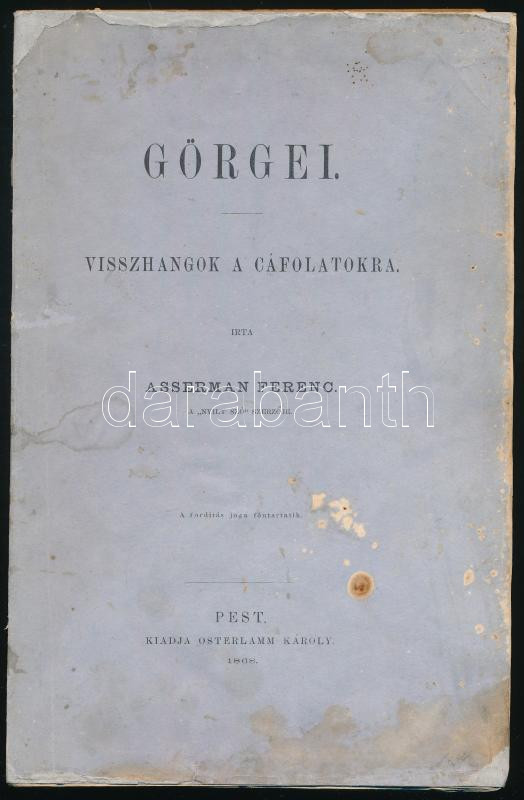 Pest, 1868. Oster... https://www.darabanth.com/en/457-Online-auction/457.0/Books/Books-History~1500020/Asserman-Ferenc-Gorgei-Visszhangok-a-cafolatokra-Pest-1868-Osterlamm-Karoly-Becs-Fromme~II3004549
