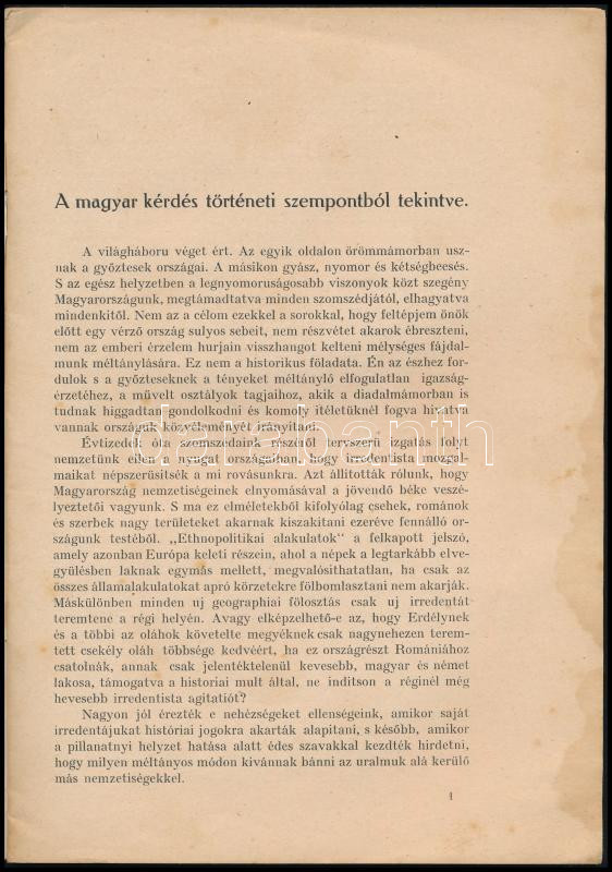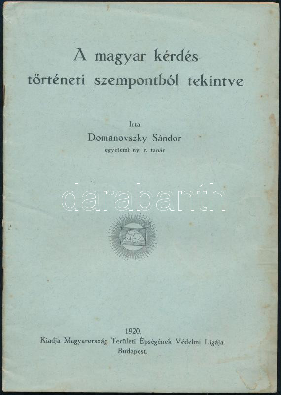Domanovszky Sándor: A magyar kérdés történeti szempontból tekintve. Bp., 1920, Magyarország Területi Épségének Védelmi Ligája, 40 p. Kiadói papÃrkötés, foltos, a borÃtón kis szakadással.