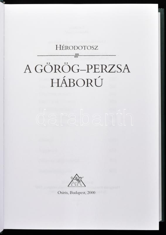 Description: Hérodotosz: A görög-perzsa háború. Fordította: Muraközi Gyula. Az utószót írta: Hegyi Dolores. A jegyzeteket Győry Hedvig és Hegyi Dolores írta. Sapientia Humana. Bp.,2000, Osiris. Kiadói kartonált papírkötés, kiadói papír védőborítóban.