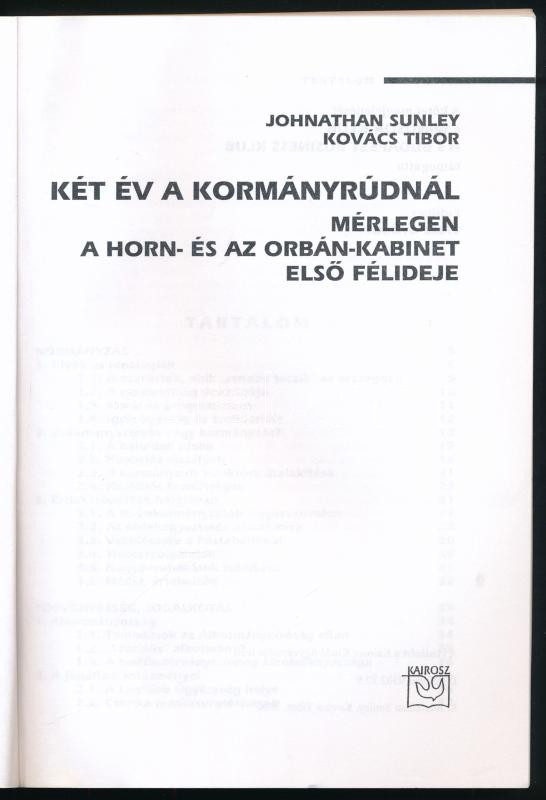 Description: Johnathan Sunley - Kovács Tibor: Két év kormányrúdnál. Mérlegen a Horn-, és az Orbán-kabinet első félideje. Bp., 2000, Kairosz. Kiadói papírkötés, foltos.