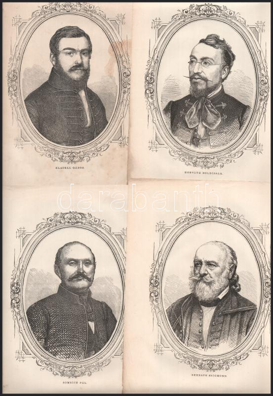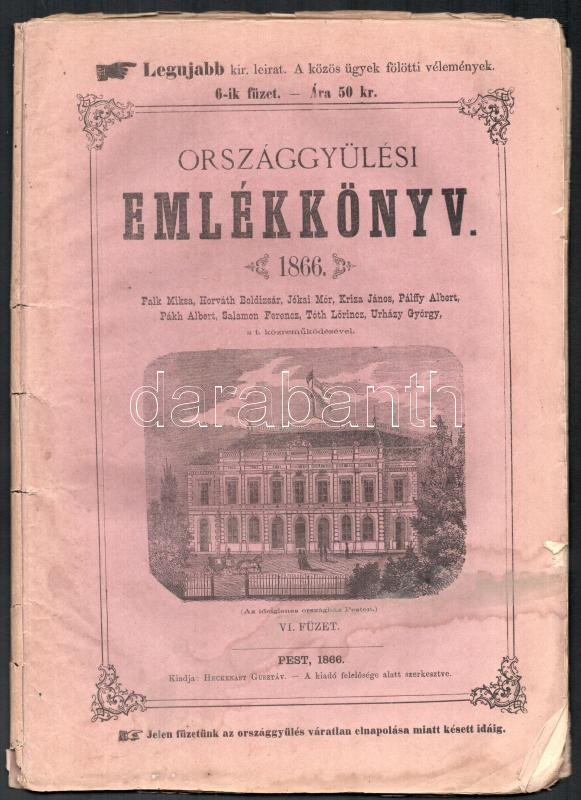 Országgyűlési emlékkönyv 1866. VI. füzet. Falk Miksa, Horváth Boldizsár, Jókai Mór, Kriza János, Pálffy Albert, Pákh Albert, Salamon Ferenc, Tóth LÅ‘rincz, Urházy György s. t. közreműködésével. Pest, 1866, Heckenast Gusztáv, 321-384 p. + 8 t. A táblákon ismert személyekkel, a kor neves közéleti személyiségeivel. Kiadói papÃrkötés, kissé szakadt borÃtóval, foltos borÃtóval és lapokkal, az utolsó lapokon gyűrÅ‘désnyommal, kijáró táblákkal, közte sérült.