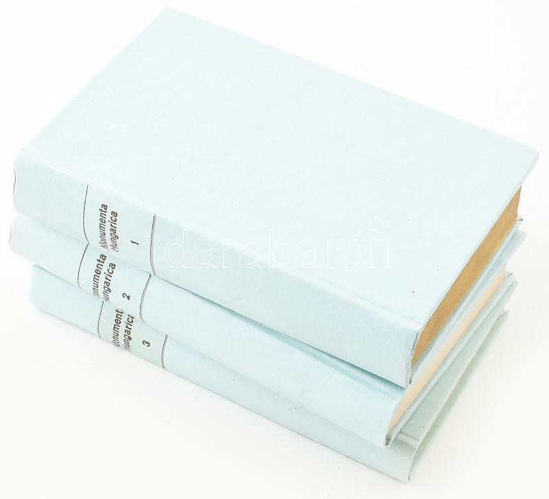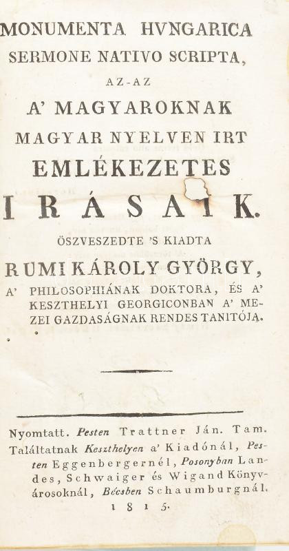 Rumi Károly György: Monumenta Hungarica sermone nativo scripta, az-az a' magyaroknak magyar nyelven irt emlékezetes irásaik. Öszveszedte 's kiadta - - . I-III. köt. [Teljes]. Pesten, 1815-1817, Trattner-ny., XXII+440+(2) p.; XII+(2)+353+(9) p.; VIII+293+(1) p. Átkötött, egységes kartonált papírkötésben, helyenként sérült, javított lapokkal, a III. kötet utolsó két lapja összeragadt. Ritka!