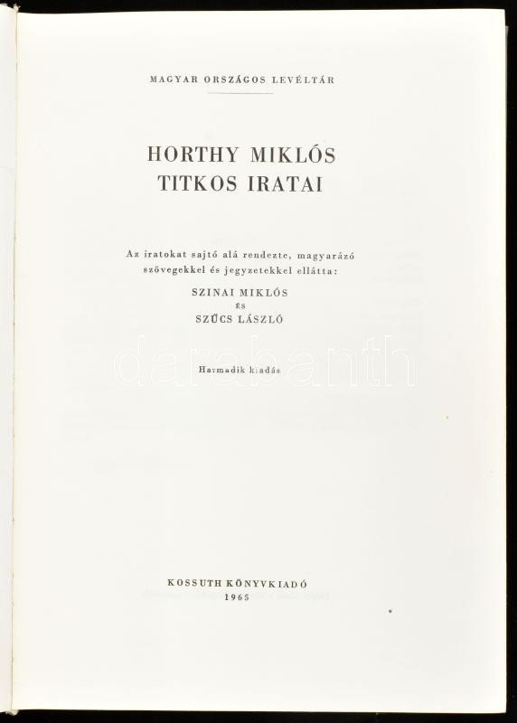 Description: Szinai Miklós - Szűcs László: Horthy Miklós titkos iratai. Az iratokat sajtó alá rendezte, magyarázó szövegekkel és jegyzetekkel ellátta: - - és - - . Magyar Országos Levéltár. Bp., 1965, Kossuth. Harmadik kiadás. Kiadói egészvászon-kötés