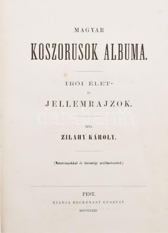 Zilahy Károly: Magyar koszorusok albuma. Irói élet- és jellemrajzok. Bp., 1863, Heckenast Gusztáv, (Landerer és Heckenast-ny.), 12+120 p.+14 (acélmetszetek) t. Első kiadás. Az acélmetszeteken: Petőfi Sándor, Kazinczy Ferenc, Kisfaludy Sándor, Berzsenyi Dániel, Kisfaludy Károly, Kölcsey Ferenc, Bajza József, Vörösmarty Mihály, Czuczor Gergely, Jósika Miklós, Eötvös József, Tompa Mihály, Jókai Mór, Arany János. Kiadói aranyozott, dombornyomású egészvászon-kötés, aranyozott lapélekkel, kopott, kissé foltos borítóval, kissé foxing foltos lapokkal.