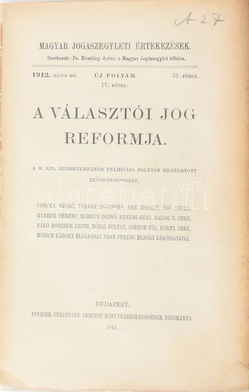 1912 A választói jog reformja. A m. kir. miniszterelnök felhívása foly... https://www.darabanth.com/en/457-Online-auction/457.0/Books/Books-Law~1500019/1912-A-valasztoi-jog-reformja-A-m-kir-miniszterelnok-felhivasa-folytan-megtartott-eloadas~II3054461