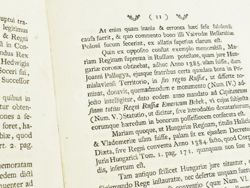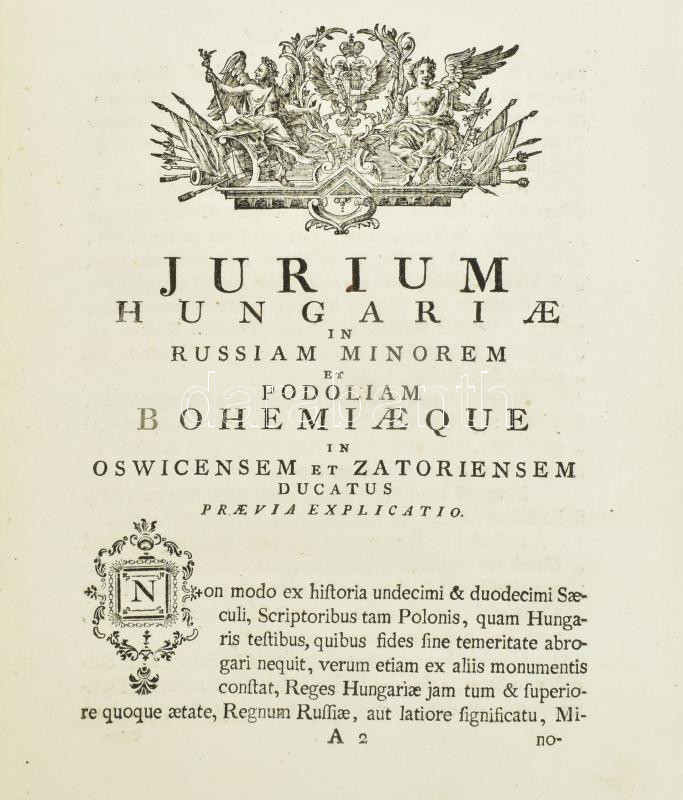[Bécs] Vindobonae, 1772. Typis Joannis Thomae Nob. De Trattnern. 44 + 42 p. A Kis-Oroszországra (Ukrajnára), Podóliára és az akkor Csehországhoz tartozó Oswic és Zator hercegségeket illető magyar jog előzetes magyarázata. Magyarországnak e címben jelölt területekre vonatkozó történetét fejti ki a szerző Korabeli kartonált papírkötésben