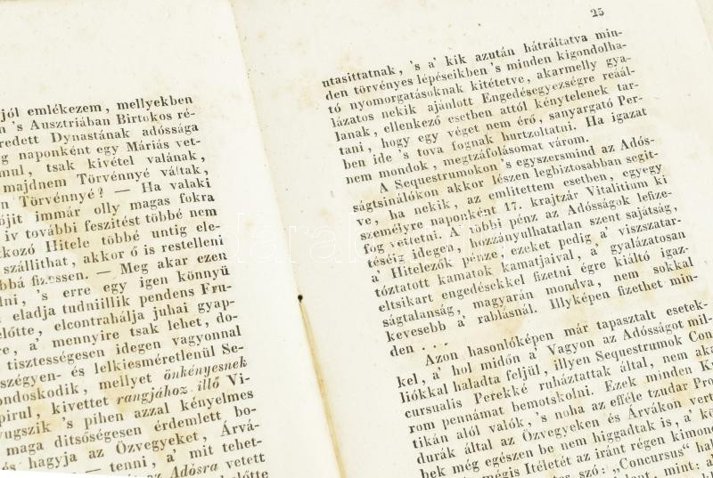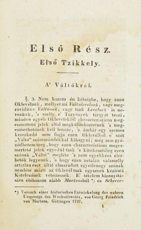 WACHTLER Bernát: Nyíltszívű észrevételek a Magyarország számára javallott váltó- s törvénykezésrendre s némelly ezzel rokon tárgyakra. Magyarra fordította: Thaisz Endre. Pesten, 1832. Ny.: Füskúti Landerer. XII. 180 p. Korabeli. kissé sérült papírborítóval fel- és körülvágatlan példány. A váltók mellett értekezik a ,,hajhászokról" , ,,Észrevételek Gróf Dessewffy József Taglalatjához" , ,,A' husárról Magyarországban". A szerző Pozsony, Zemplén, Torna, Esztergom és Liptó vármegyék táblabirája, és országgyűlési követ. Címeres viaszpecséttel a címlapon