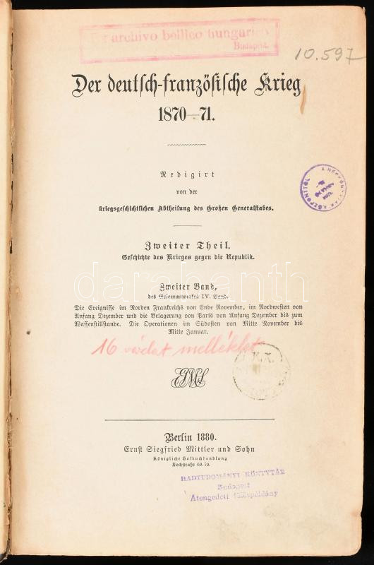 Der Deutsch-Französische Krieg 1870-1871. Redigirt von der kriegsgeschichtlichen Abtheilung des Großen Generalstabes. Zweiter Theil, Geschichte des Krieges gegen die Republik. Zweiter Band, des Gesammtwerkes IV. Band. Berlin, 1880, E. S. Mittler & Sohn. Német nyelven Térkép-mellékletekkel. Korabeli félbőr kötésben, sérült és hiányzó gerinccel, kissé kopott borítóval, kissé sérült kötéssel, intézményi bélyegzőkkel, utolsó néhány lap széle szöveget nem érintő kisebb sérüléssel.