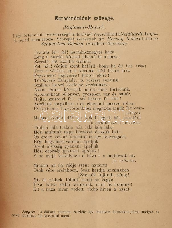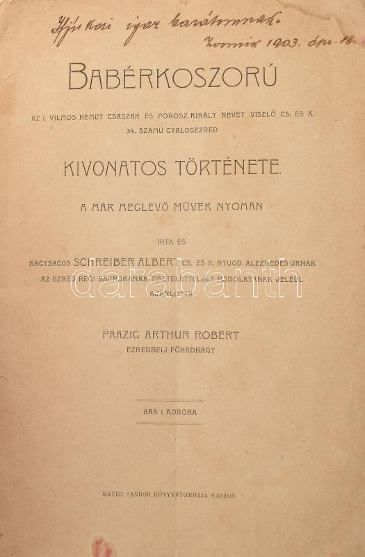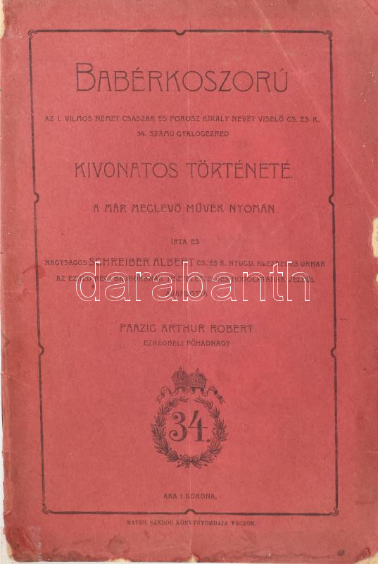 Paazig Arthur Robert: Babérkoszorú. Az I. Vilmos német császár és porosz király nevét viselő cs. és k. 34. számú gyalogezred kivonatos története. A már meglévő művek nyomán írta és nagyságos Schreiber Albert cs. és k. nyugd. alezredes úrnak az ezred régi bajnokának tiszteletteljes hódolatának jeléül ajánlotta - - - ezredbeli főhadnagy. Vácz,én.Mayer Sándor, 67+5 p.Kiadói papírkötés, sérült, részben javított borítóval, foltos lapokkal, 1903-as ajándékozási bejegyzéssel.