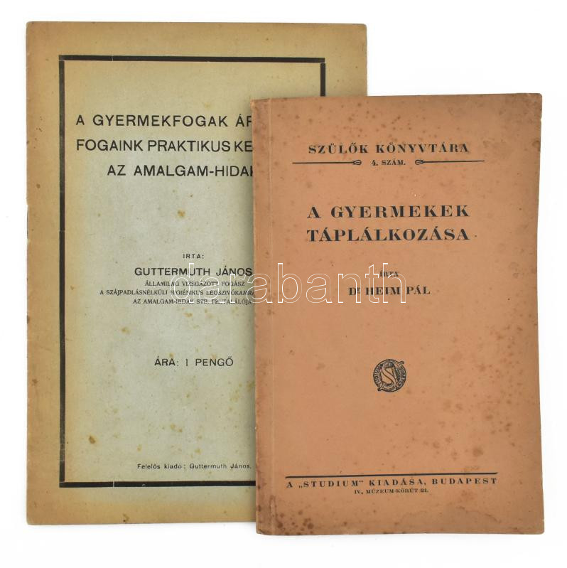 2 db gyermekegészségügyi füzet: Dr. Heim Pál: A gyermekeke táplálkozása. Szülők Könyvtára 4. sz. Bp., [1926], "Studium" (Franklin-ny.), 56 p. Kiadói papírkötés, foltos borítóval, belül nagyrészt jó állapotban. + Guttermuth János: A gyermekfogak ápolása. Fogaink praktikus kezelése. Az amalgam-hidakról. Bp., 1928, Held-ny. Kiadói tűzött papírkötés, foltos borítóval, kissé hullámos.