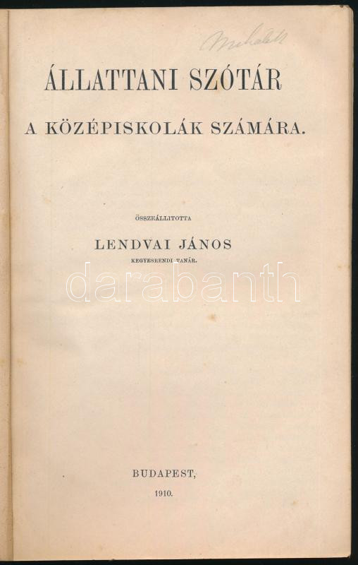 Állattani szótár a középiskolák számára. Összeáll.: Lendvai János. Bp., 1910, (Franklin-ny.), 103 p. Átkötött félvászon-kötésben, helyenként lapszéli ázásnyomokkal.