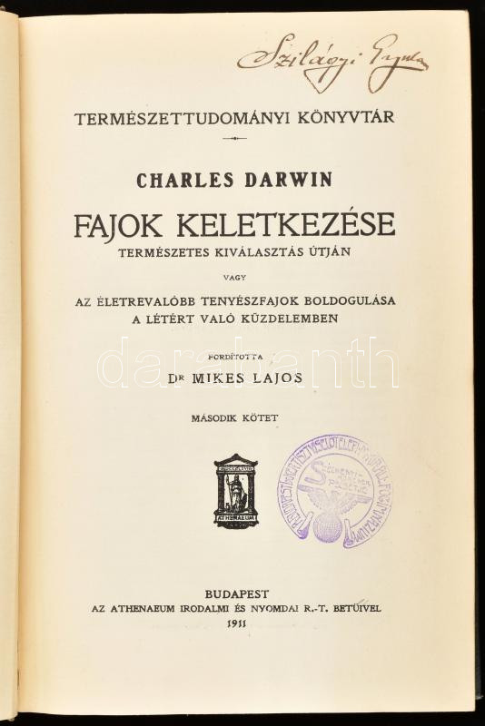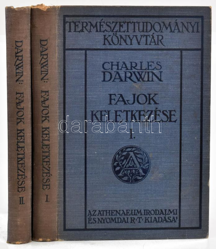 Charles Darwin: Fajok keletkezése. I-II. köt. Fajok keletkezése természetes kiválasztás útján vagy az életrevalóbb tenyészfajok boldogulás a létért való küzdelemben. Ford.: Mikes Lajos. Természettudományi Könyvtár. Bp., 1911, Athenaeum, XIX+283 p. +1 (kihajtható képtábla) t.; 310 p. Kiadói egészvászon-kötés, kissé kopott borítóval, fakó gerinccel, az egyik gerincen kis sérüléssel, régi bélyegzésekkel.