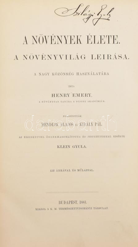 Henry Emery: A növények élete. A növényvilág leírása. Ford.: Mendlik Alajos és Király Pál. Az eredetivel összehasonlította és jegyzetekkel kísérte Klein Gyula. Természettudományi Könyvkiadó-Vállalat XXII. Bp.,1883, K. M. Természettudományi Társulat, XIV+783 p. Átkötött aranyozott gerincű egészvászon-kötés, kopott borítóval, a gerincen kis sérülésekkel.
