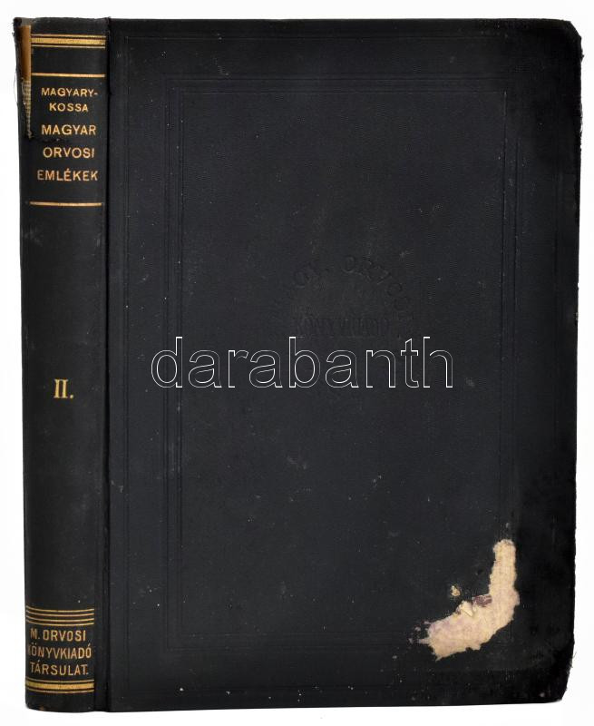 Magyary-Kossa Gyula: Magyar orvosi emlékek. Értekezések a magyar orvostörténelem köréből II. köt. Magyar Orvosi Könyvkiadó Társulat Könyvtára CXXII. köt. Bp., 1929, Magyar Orvosi Könyvkiadó Társulat, 6+337 p. Szövegközti illusztrációkkal. Kiadói aranyozott egészvászon-kötés, kopott borítóval, a borítón címkenyommal, sérült gerinccel.
