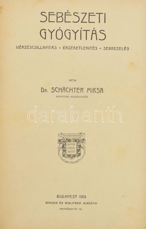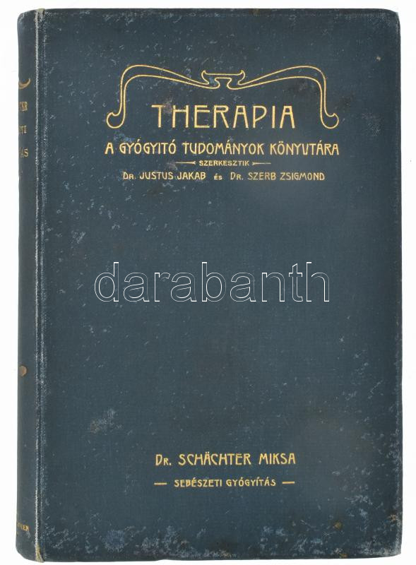 Schächter Miksa: Sebészeti gyógyítás. Therapia,a gyógyító tudományok könyvtára IV. köt. Bp., 1904, Singer és Wolfner,256+20 p. Szövegközti illusztrációkkal. Korabeli reklámokkal. Kiadói aranyozott egészvászon-kötés, Leszik-kötés, festett lapélekkel, kopott borítóval, foltos lapokkal.